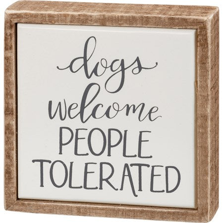 A wooden box sign mini featuring a hand lettered "Dogs Welcome People Tolerated" sentiment and faux enamel finish for tile-like appearance. Easy to hang or can free-stand alone.