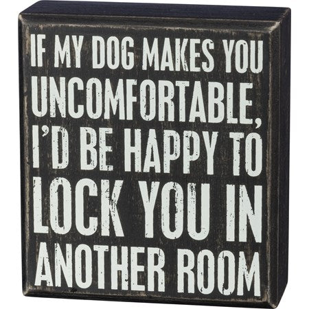 A classic black and white wooden box sign featuring a distressed "If My Dog Makes You Uncomfortable, I'd Be Happy To Lock You In Another Room" sentiment. Easy to hang or can free-stand alone.