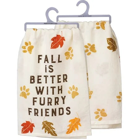A rustic cotton kitchen towel featuring a "Fall Is Better With Furry Friends" sentiment and leaf designs throughout. Machine-washable.